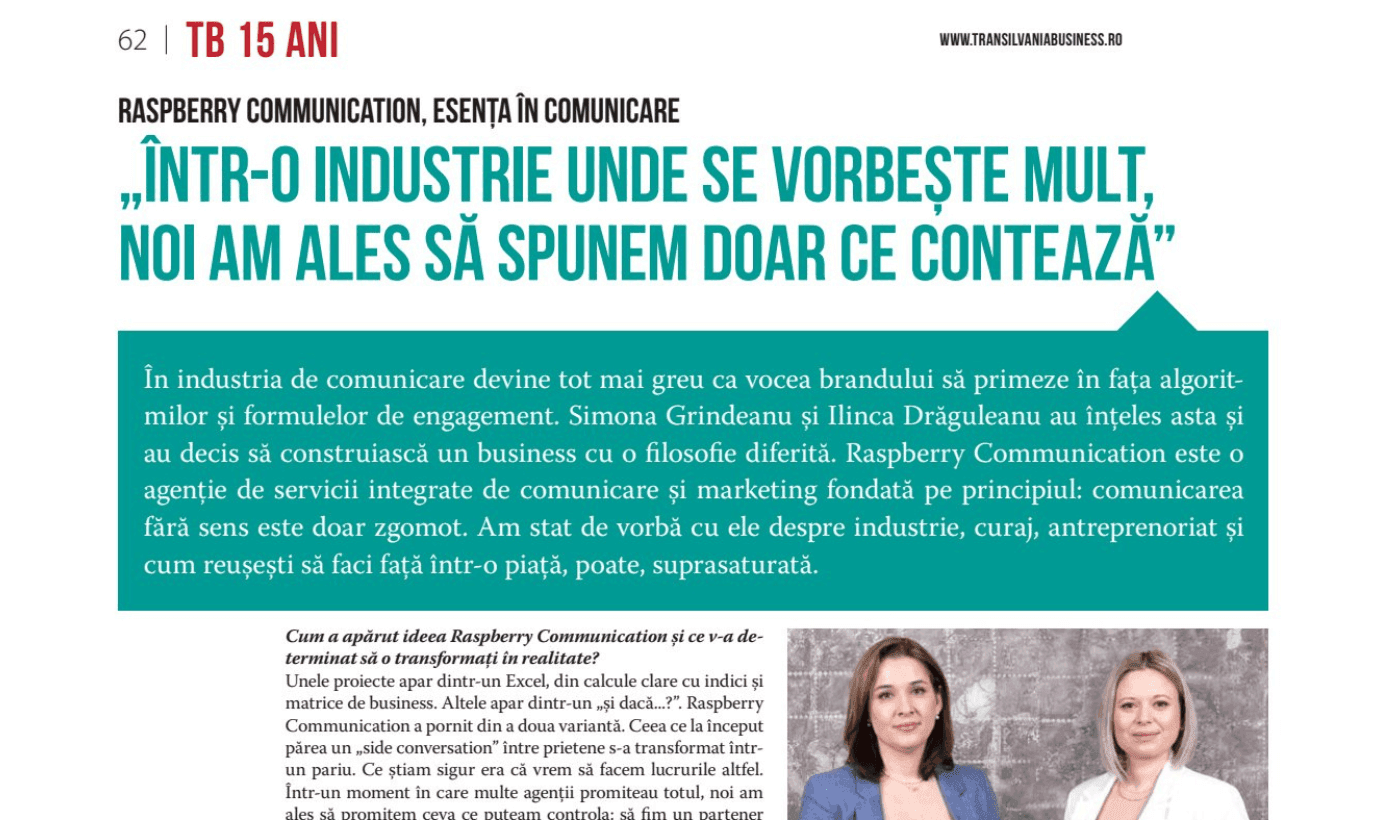 In industria de comunicare devine tot mai greu ca vocea brandului să primeze in fata algoritmilor și formulelor de engagement. șimona Grindeanu și Ilinca Drăguleanu au inteles asta și au decis sa construiasca un business cu o filosofie diferita. Raspberry Communication este o agentie de servicii integrate de comunicare și marketing fondata pe principiul: comunicarea fara sens este doar zgomot. Am stat de vorba cu ele despre industrie, curaj, antreprenoriat și cum reusesti să faci fata într-o piata, poate, suprasaturată.